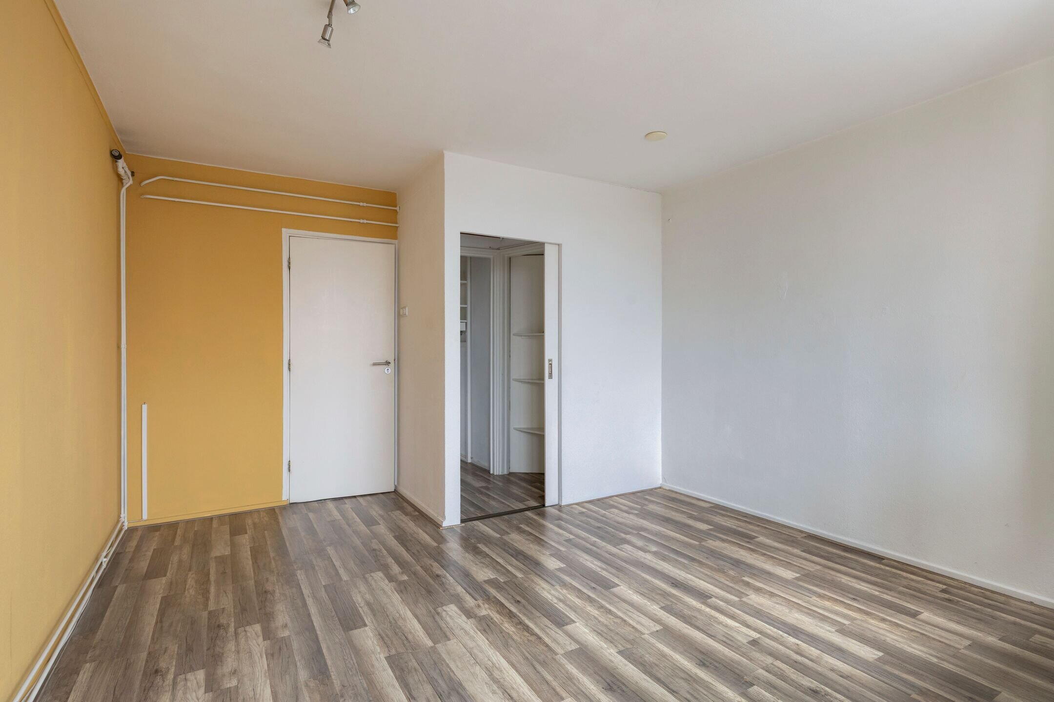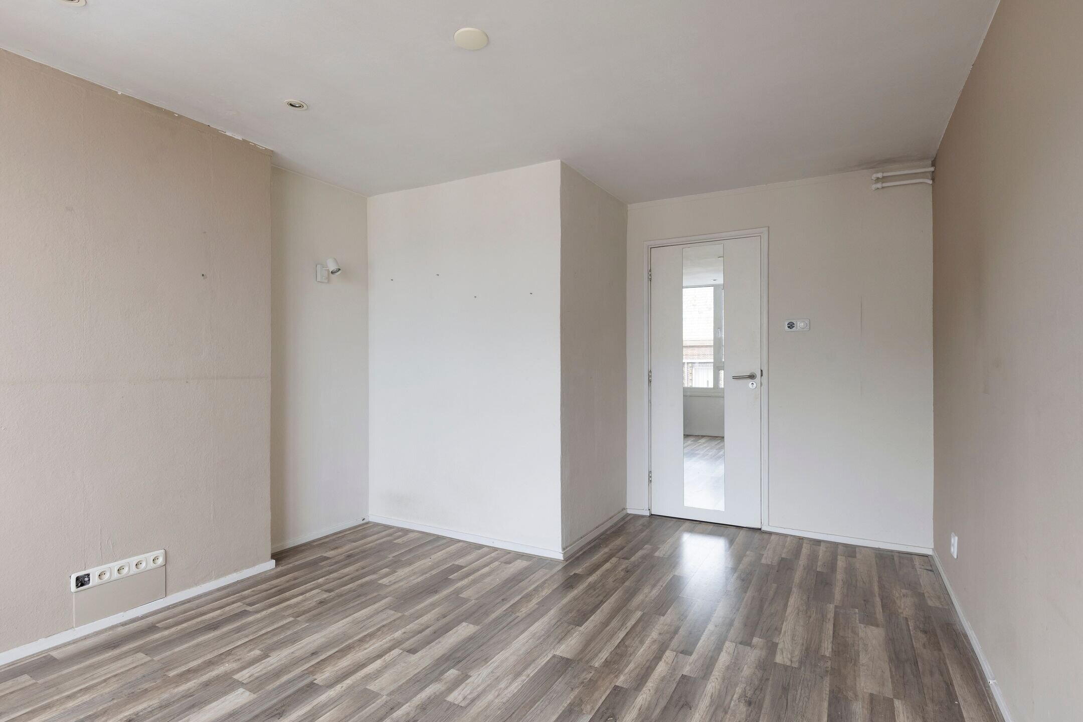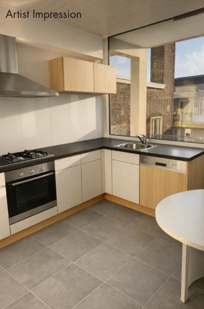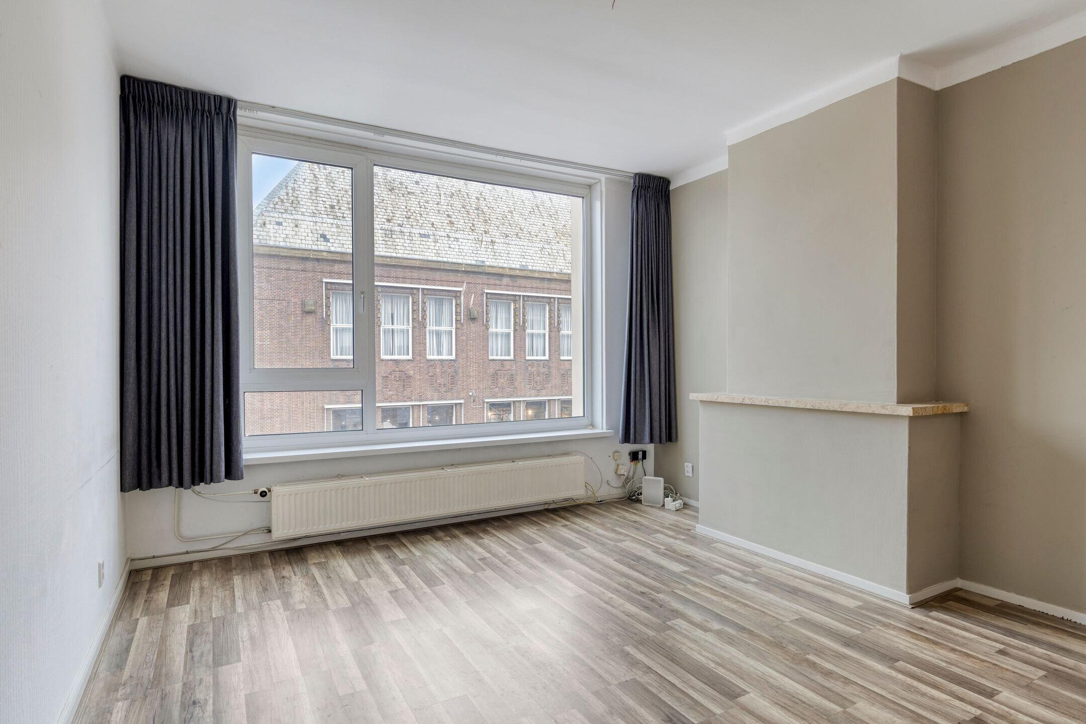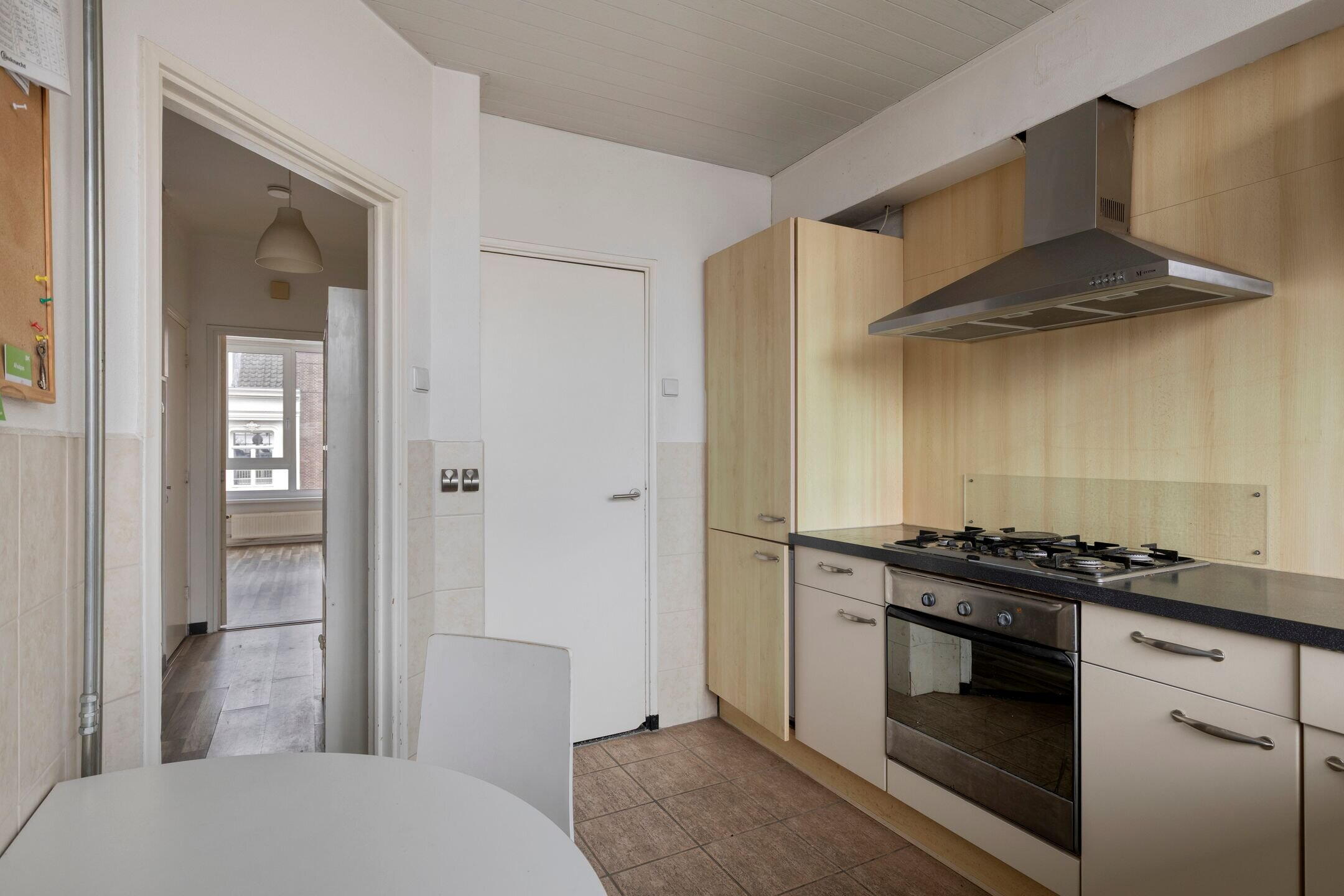 Derde verdieping / eerste woonlaag: via het trappenhuis kom je op de derde verdieping alwaar de voordeuren van 4 maisonnettes zijn gelegen; kleinschalig dus. De privé-entree brengt je in het tochtportaal van de woning en via de hal met trapkast, bergkast en toilet bereikbaar je de woonkamer. De woonkamer beschikt over een vaste kast en hiervandaan kijk je aan de overzijde uit op het statige van pand van de C&A. Naast de entree is een eetkeuken met een in hoek opgestelde inrichting die is voorzien van enkele ingebouwde apparaten. Vanuit de keuken is ook een berg-provisiekast toegankelijk met daarin de aansluiting van de wasmachine.